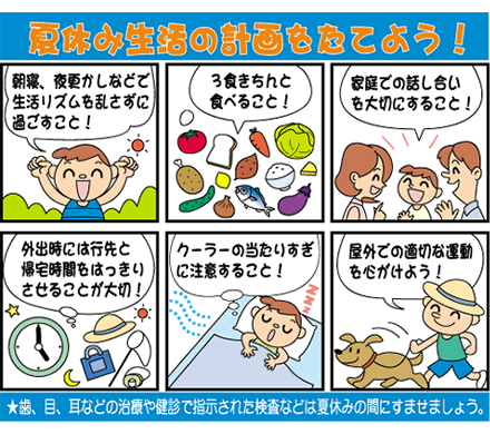 夏休みは生活習慣や体調を見直すいい機会です。歯、目、耳などの治療や、健康診断で指示された検査などは夏休みの間にすませましょう。